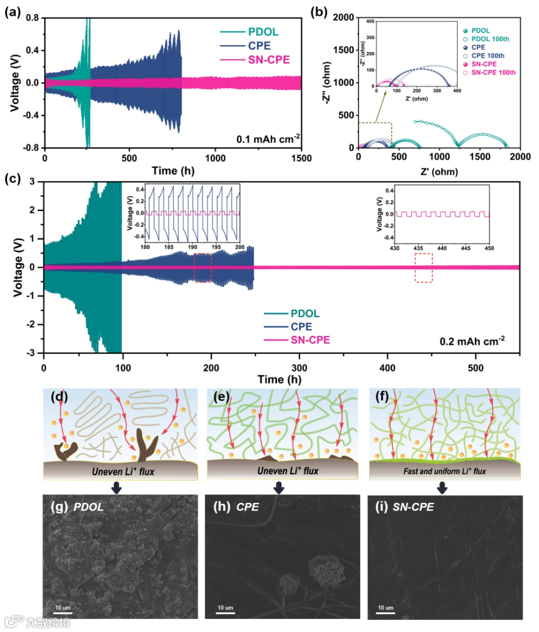 使用SN-CPE作为电解质时,锂金属对称电池相比于PDOL基电解质和传统的醚基电解液(LE)都有显著提升。图4a和图4c展示了不同电流密度下不同电解质的锂金属对称电池循环性能,SN-CPE在循环过程中表现出最佳的稳定性和更低的极化电压,这归因于SN-CPE与金属锂之间的良好接触和持续稳定的界面以及更高的离子导和锂离子迁移系数。SEM图像(图4g-i)也证明了,在SN-CPE电解质的锂金属电池中,无锂枝晶产生。