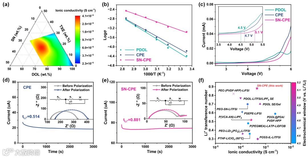 电化学测试表明,该电解质具有较高的离子电导率(25°C下为4.06×10-4 S cm-1),很高锂离子迁移数(0.881)和高抗电化学氧化能力(5.1V vs Li/Li+),能够实现室温下快速的离子传导、优异的电化学行为、并且能匹配高电压正极材料。