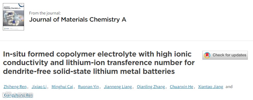 基于此,深圳大学梁健能研究员和任祥忠教授等人在国际知名期刊Journal of Materials Chemistry A上发表了题为“In-situ formed copolymer electrolyte with high ionic conductivity and lithium-ion transference number for dendrite-free solid-state lithium metal batteries”的研究工作。深圳大学博士后任志恒、硕士研究生李继潇为本文的共同第一作者。