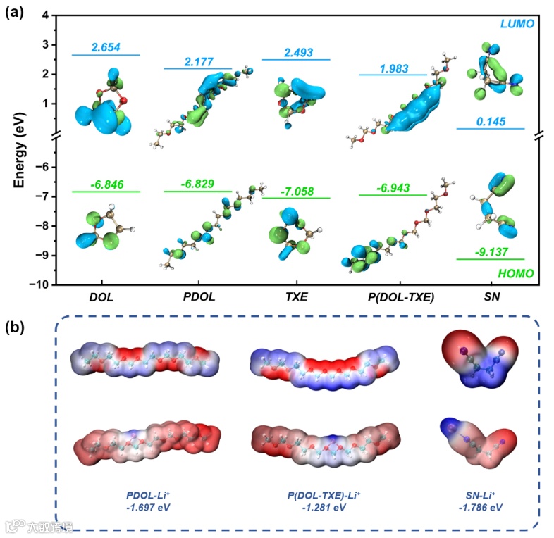 通过第一性原理计算分析三种组分(DOL、TXE、SN)在聚合前后的协同作用。首先,共聚合的DOL-TXE和SN具有更低的HOMO能级,这预示着电解质具有更强的高电压稳定性。同时,通过静电势分布和结合能的计算证明了锂离子在共聚物主链上的快速迁移,以及SN的溶剂化作用使得电解质的锂离子迁移数提高。