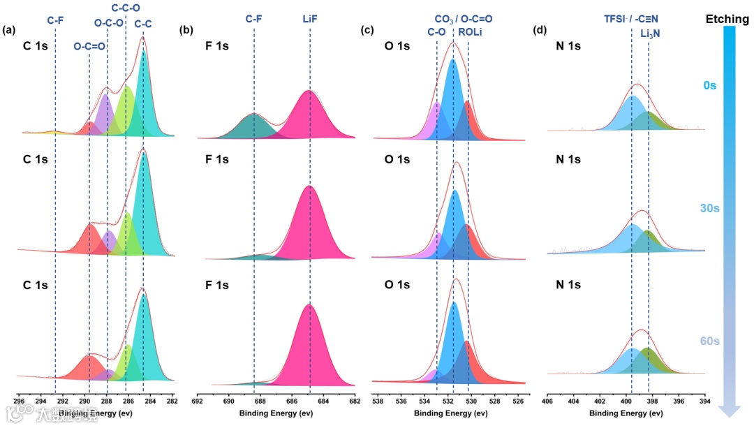 不同深度的XPS分析表明,SN-CPE在锂金属表面形成的SEI富含多种无机组分(LiF、Li3N、Li2CO3)和有机组分,并且随着蚀刻过程的进行,无机组分的比例逐渐增加,这表面靠近锂金属的SEI层富含无机材料,而靠近电解质的SEI富含无机物,这种独特的有机-无机复合SEI有利于SEI的长期稳定性和均匀的锂离子脱嵌行为。