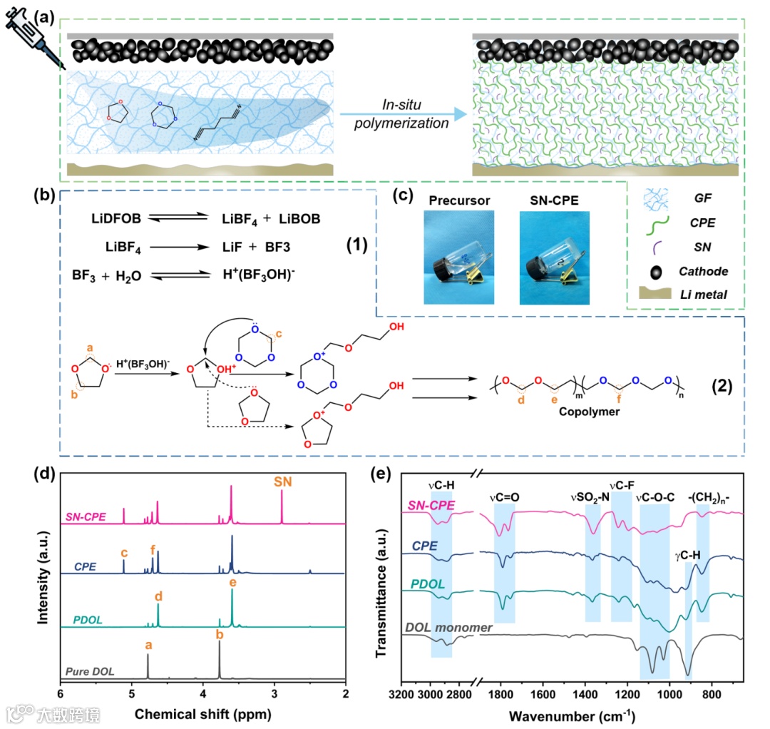 作者采用原位聚合的策略,通过锂盐(LiDFOB)引发1,3-二氧戊环(DOL)和1,3,5-三噁烷(TXE)两种环醚单体发生聚合反应,合成了一系列了共聚合物电解质(CPE),并使用少量的丁二腈(SN)作为增塑剂,提出了一种可以在室温下应用的准固态聚合物电解质(SN-CPE)。