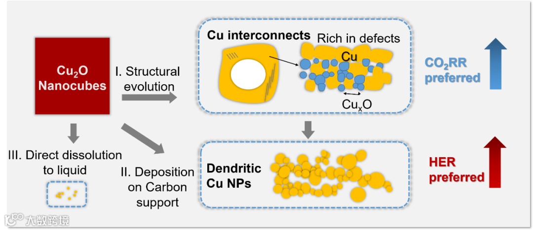 图1. CO2电化学还原过程中Cu2O纳米立方体的结构演变过程
