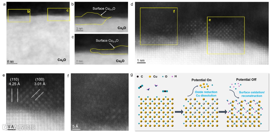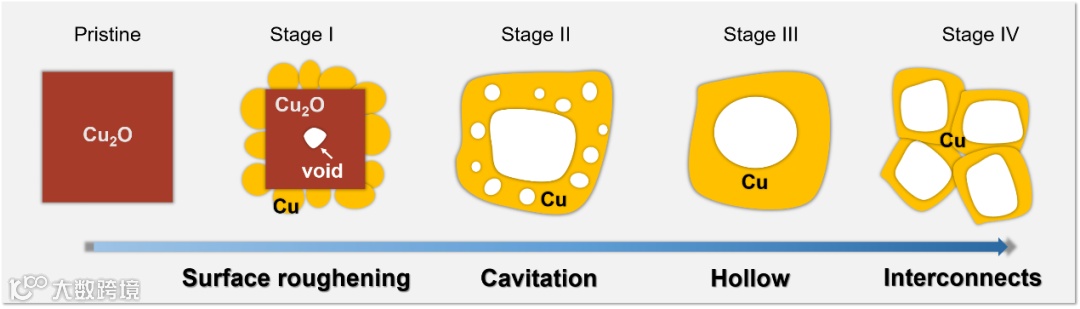 在反应的最初阶段,氧化亚铜颗粒表面有极为特殊的结构,该结构与氧化亚铜基底有着严格的外延生长的取向关系,并且区别于铜及其化合物,晶格常数的测量和DFT计算证明这可能是Cu-O-H。相比于氧化亚铜,该结构同时缺少了氧原子和部分铜原子,这证明结构转变是以氧化物的脱氧过程为起点的,也证明了在反应初期确实存在铜原子的溶解。