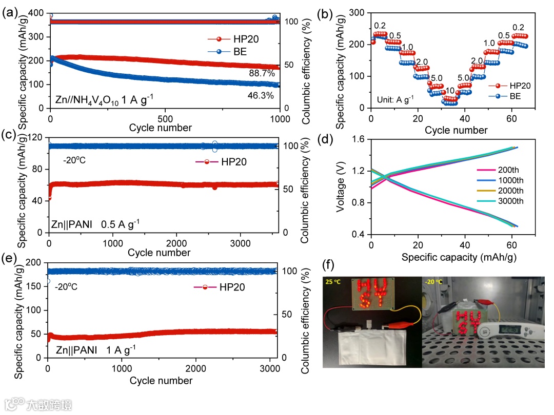 (a)Zn||NH4V5O10电池在BE以及HP20电解液中的长循环以及(b)倍率性能对比图;(c-f)-20oC时,Zn||PANI电池在HP20电解液中以(c)0.5Ag-1以及(e)1 Ag-1电流密度下的循环性能对比图;(f) Zn||PANI软包电池在25oC以及 -20oC时点亮灯泡的光学照片图;