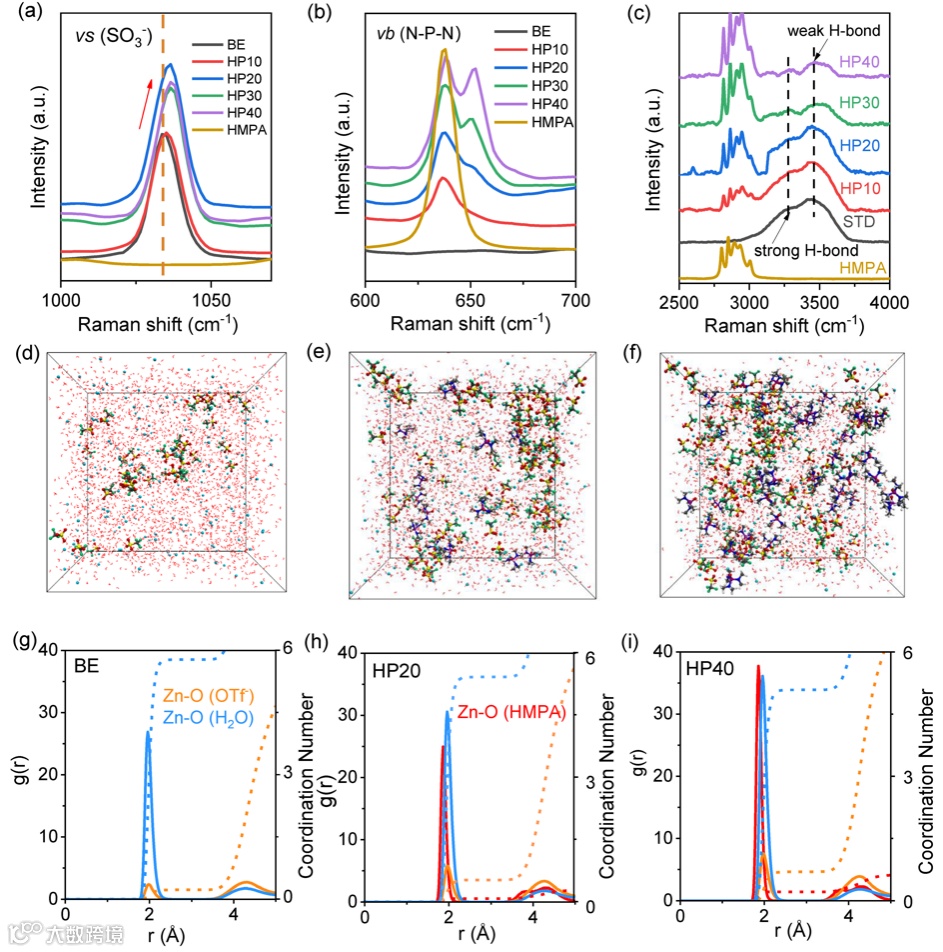 图1. 不同电解液的拉曼吸收峰;(a) SO32- 的伸缩振动峰;(b)N-P-N的弯曲振动峰;(c)OH-伸缩振动吸收峰;(d-f)BE, HP20以及HP40电解液的分子动力学模拟;(g-i)不同电解液的RDF数据以及CN计算;