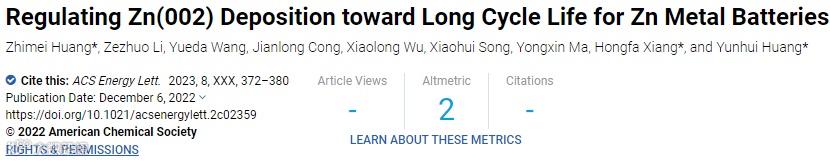 Z. M. Huang,* Z. Z. Li, Y. D. Wang, J. L. Cong, X. L. Wu, X. H. Song, Y. X. Ma, H. F. Xiang,* and Y. H. Huang* ,Regulating Zn(002) Deposition toward Long Cycle Life for Zn Metal Batteries. ACS Energy Lett. 2023, 8, 372−380.