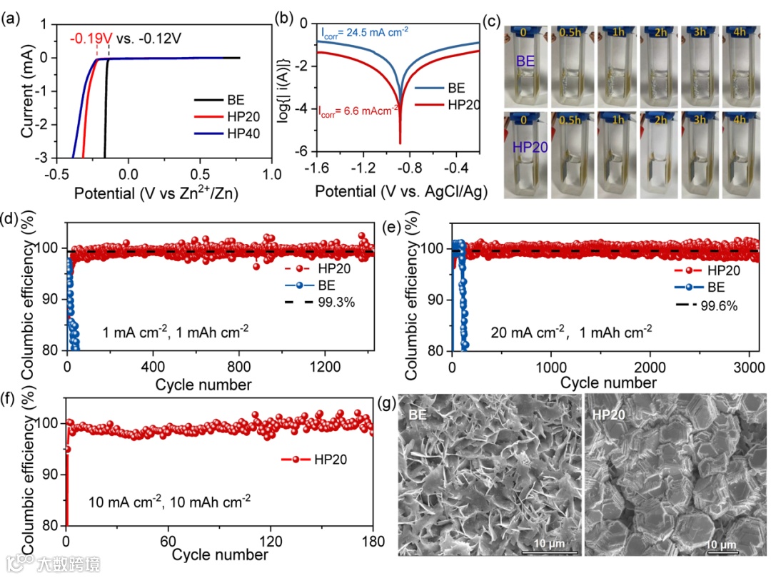 (a)不同电解液的电化学窗口比较;(b)Tafel曲线分析;(c)原位透明电池监测锌在不同电解液中的沉积行为;(d-f)Zn||Cu电池在不同电流密度下的库伦效率比较;(g) Zn在BE以及HP20电解液中的沉积形貌对比图;