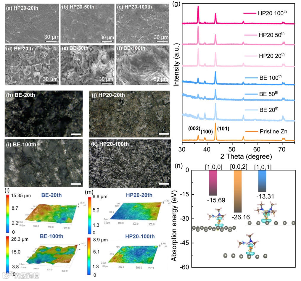 图3. (a-f)锌对称电池在BE以及HP20电解液中循环20,50以及100圈之后的形貌对比图;(g)相应的xrd衍射分析;(h-m)循环不同20以及100圈之后锌片的超景深分析图;(n)HMPA在不同晶面的吸附能比较;