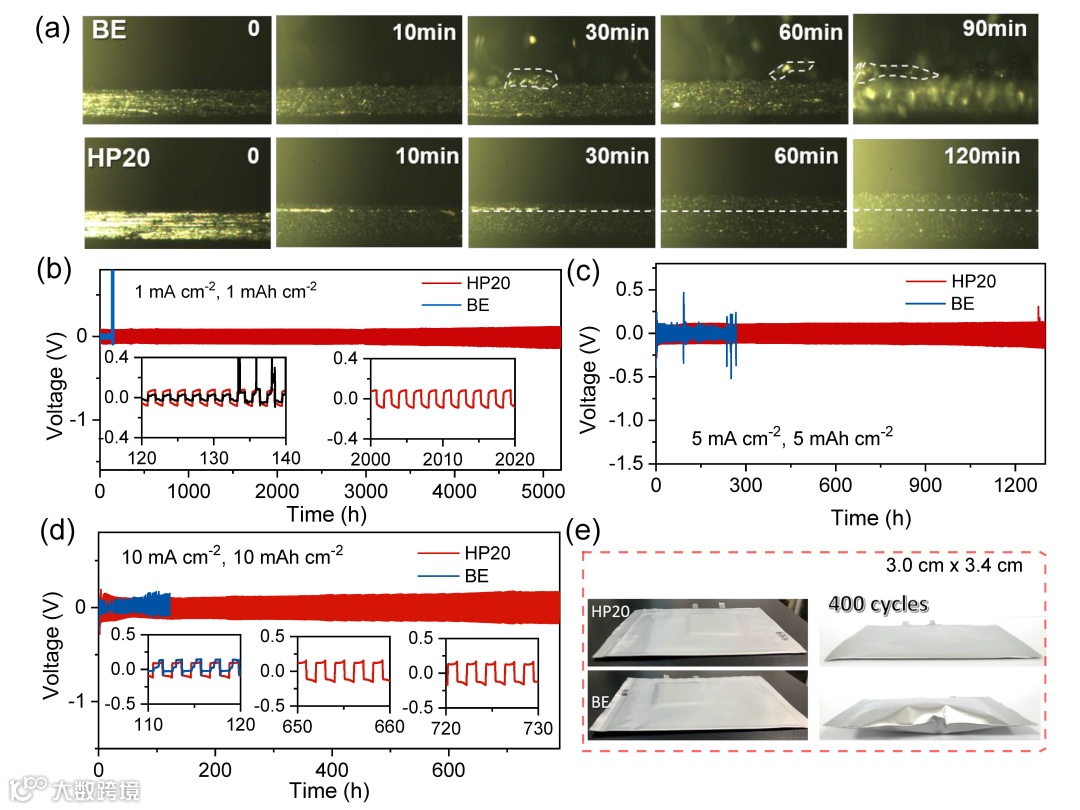 (a)原位观察锌在BE以及HP20电解液中的沉积行为;(b-d)锌对称电池在不同电流密度以及容量下的沉积与剥离行为;(e) 软包对称锌电池在BE以及HP20电解液中循环之后的光学照片图;
