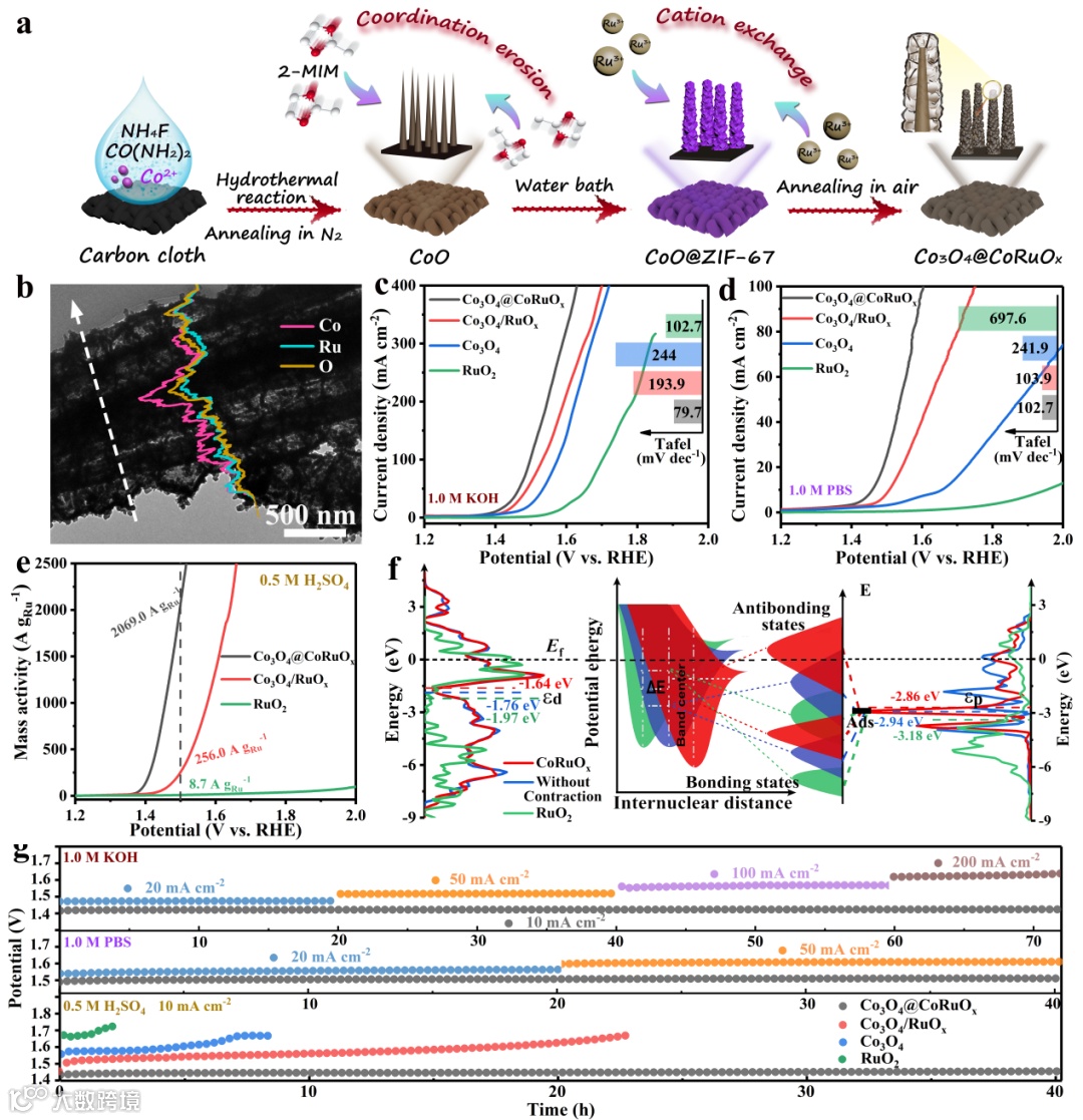 该工作结合原位MOF衍生和离子交换策略在Co3O4纳米锥表面构建了盔甲状钴掺杂RuOx壳层(Co3O4@CoRuOx)。该催化剂钌含量低至3.7 wt%,对于OER表现出优异的催化活性。在碱性(1.0 M KOH)、中性(1.0 M PBS)和酸性(0.5 M H2SO4)电解液中,达到10 mA·cm-2电流密度的过电位分别为167 mV、229 mV和161 mV,同时具有数十小时的超强运行稳定以及超高的质量活度(1270.0 A gRu-1 in 1.0 M KOH, 259.9 A gRu-1 in 1.0 M PBS 和 2069.0 A gRu-1 in 0.5 M H2SO4 在 η = 270 mV),是迄今为止报道最佳的全pH值OER催化剂之一。