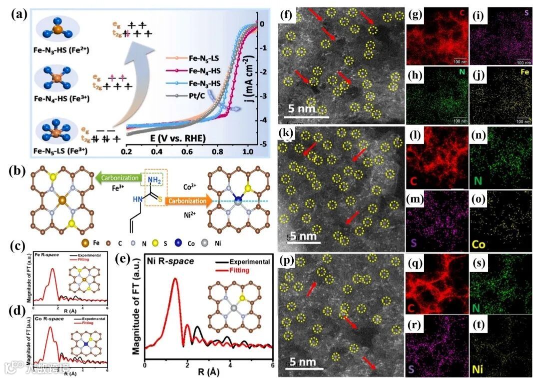 图6. (a) 通过活性测量和理论计算确定的基于 SAC 的 Fe-N-C 中 Fe 活性中心的电子自旋态调制。(b) 在不同配位环境下形成 Fe-SAs/NSC、Co-SAs/NSC 和 Ni-SAs/NSC 的示意图,(c-e) 实验数据与拟合的(c) Fe-SAs/NSC,(d)Co-SAs/NSC,和(e)Ni-SAs/NSC的EXAFS曲线。(f, k, p) Fe-SAs/NSC、Co-SAs/NSC 和 Ni-SAs/NSC 的 HAADF-STEM 图像,显示单个原子和面内孔隙(红色箭头), (g-j, l-o, q-t) M-SAs/NSC中C、N、S、Fe、Co 和Ni元素的HAADF-STEM元素分布(M=Fe、Co、Ni)。