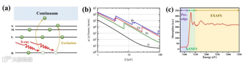 图2. (a) 吸收原子中的电子被X射线激发的示意图。(b) 在 1 至 100 keV 的X射线能量范围内,Fe、Cd和Pb的质量衰减系数μ/ρ。(c) XAS 谱图,突出显示XANES和EXAFS区域。