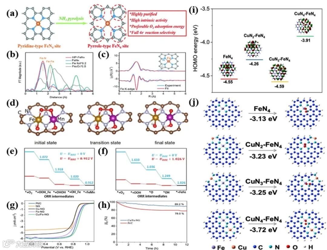 图 5.(a)高纯度吡咯型 FeN4 结构的制备过程。灰色、蓝色和橙色球体分别代表C、N 和 Fe原子,(b) Fe 箔、Fe2O3、HP-FeN4和FeN4的EXAFS光谱的傅立叶变换和 (c) EXAFS 光谱的傅立叶变换的第一壳层拟合 对于 HP-FeN4。顶部和底部光谱分别是幅度和虚部。插图:HP-FeN4材料中铁位点的结构。(d) FeMnN6团簇上吸收的*OOH的分裂,能垒为0.10 eV。“laying down”构型中吸收的*OOH、过渡态和分裂*OOH,(e) OH 修饰的FeMnN6上ORR过程的理论吉布斯自由能分布,(f) 的理论吉布斯自由能分布 嵌入石墨烯晶格中的 OH 修饰的 Fe2N6 团簇的ORR过程。(g) 所制备催化剂和Pt/C的LSV曲线,(h) Cu/Fe-NG 和 Pt/C 的计时电流响应,(i) 四种不同模型的HOMO能级,(j) 计算模型,O2吸附构型,以及FeN4和CuNx–FeN4 (x = 2, 3, 4)的相应吸附能。