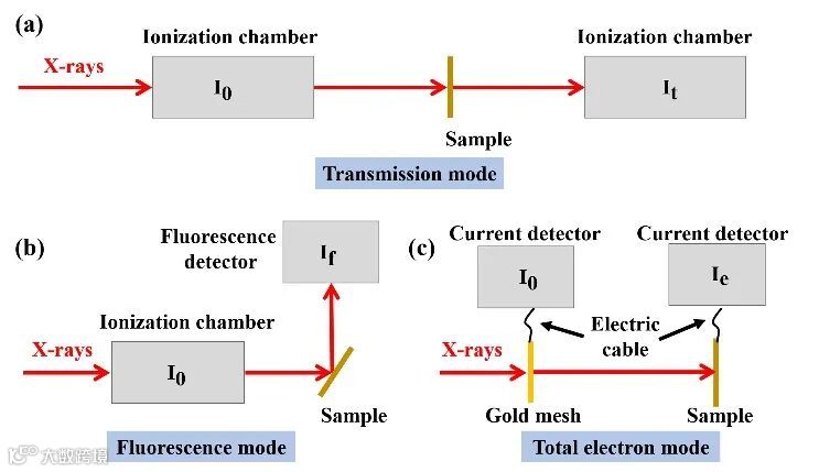 图3. XAS 实验装置在 (a) 透射模式、(b) 荧光产额模式和 (c) 电子产额模式下的示意图。