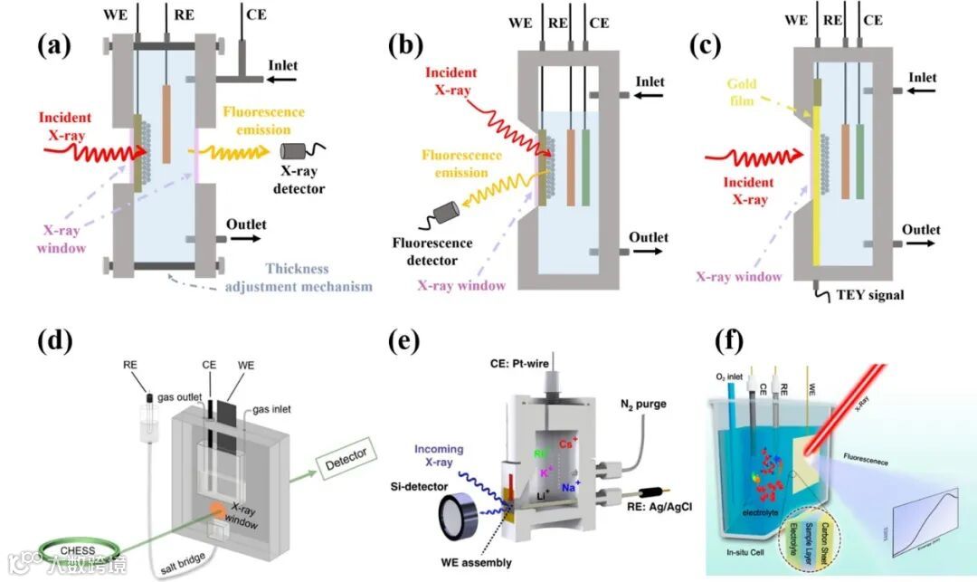 图4. (a) 透射模式、(b)荧光产额模式,和(c)电子产额模式的原位XAS电化学电池的描述。WE:工作电极。RE:参比电极。CE:对电极。(d) 用于透射模式的原位XAS电化学电池的图示。(e)用于荧光产额模式的原位 XAS 电化学电池示意图。(f) 用于荧光产额模式的原位XAS电化学电池的图示。