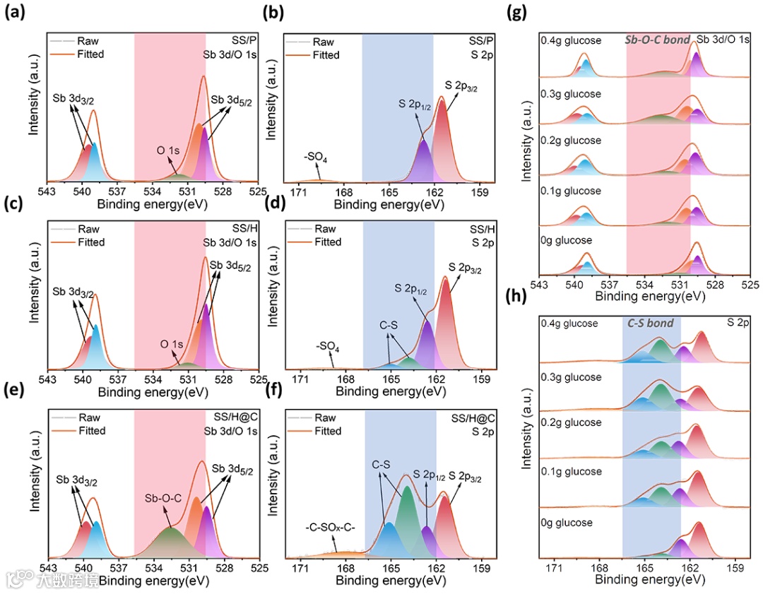 Figure 2 XPS spectra of the as-obtained samples: high-resolution spectrums of a, b) Sb 3d and S 2p of SS/P, c, d) Sb 3d and S 2p of SS/H, e, f) Sb 3d and S 2p of SS/H@C, g) Sb 3d of SS/H@C with different dosage of glucose, h) S 2p of SS/H@C with different dosage of glucose.