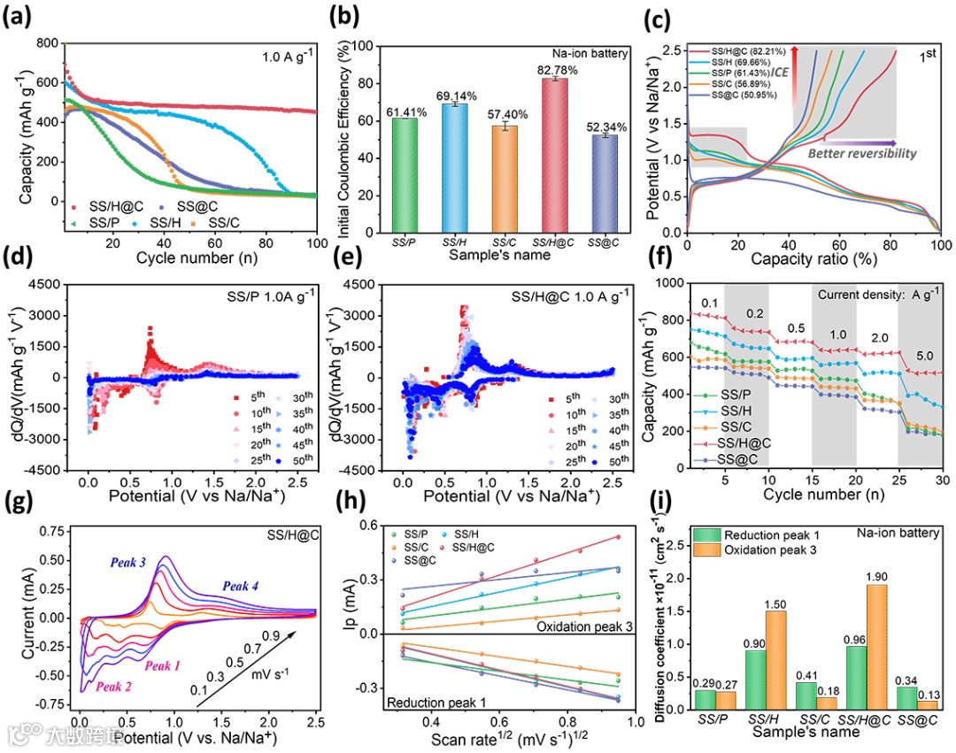 Figure 4 The Na-ion storage capabilities and electrochemical kinetics of the as-obtained samples: a) cycling performances at 1.0 A g−1, b) average ICE, c) the 1st GCD profiles at 1.0 A g-1, d, e) dQ/dV curves of SS/P and SS/H@C from 10th to 100th at 1.0 A g-1, f) rate performances at stepwise current densities from 0.1 A g-1 to 5.0 A g-1, g) CV curves of SS/H@C at stepwise scan rates from 0.1-0.9 mV s-1, h) the fitted IP/v1/2 curves, i) DLi+ of reduction peak 1 and oxidation peak 3.