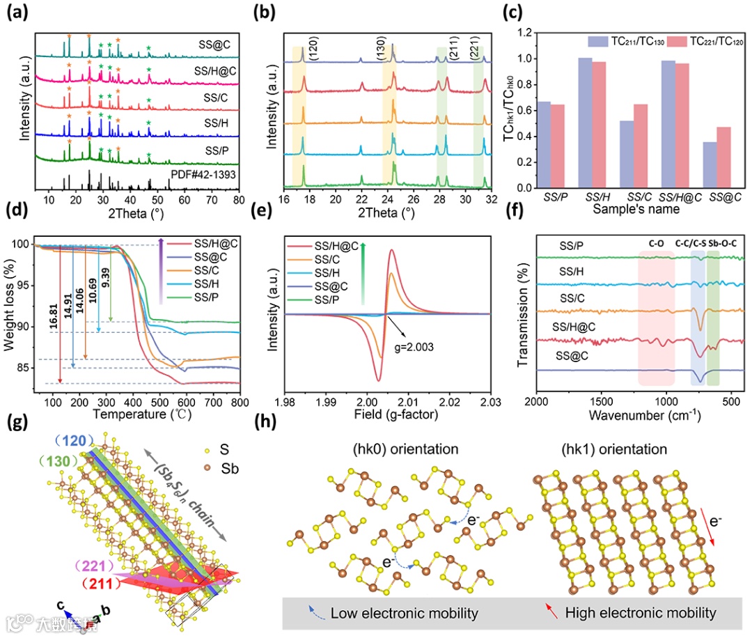 Figure 1 The physical-chemical properties of the as-obtained samples: a) XRD patterns, b) partially magnified XRD patterns, c) texture coefficient ratio of TC(211)/TC(130) and TC(221)/TC(120), d) TG curves, e) ESR spectrums, f) FT-IR spectrums, g) crystal structure illustration of (hk0) and (hk1) crystal planes in the quasi-1D (Sb4S6)n chains and h) schematic diagram of electron transporting along (hk0) and (hk1) orientation.