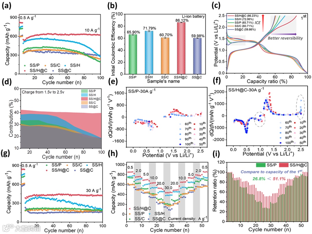 Figure 3 The Li-ion storage capabilities of the as-obtained samples: a) cycling performances at 10.0 A g−1, b) average ICE at 0.5 A g-1, c) the 1st GCD profiles at 0.5 A g-1, d) charging capacity contribution of conversion reaction from 10th to 100th at 10.0 A g-1, e, f) dQ/dV curves of SS/P and SS/H@C from 10th to 100th at 30.0 A g-1, g) cycling performance at 30.0 A g−1, h) rate performances at stepwise current densities from 0.5 A g-1 to 30.0 A g-1, i) capacity retention rates of SS/P and SS/H@C compared to the capacity of their 1st cycle.