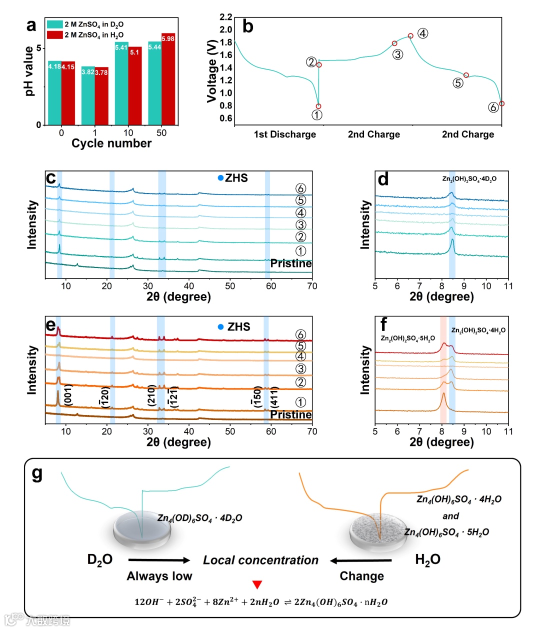 在循环过程中生成具有不同结构的ZHS可能很容易被忽视,但却是影响ZIBs循环性能的重要因素。如图4g所示,生成的ZHS的相可以用水分子的局部浓度来解释。当电极-电解质界面处的水分子浓度足够大时,往往会生成Zn2(OH)2SO4·5H2O。全电池在H2O基电解液中的首次放电中,Zn2(OH)2SO4·5H2O占主导地位,很难检测到Zn2(OH)2SO4·4H2O。