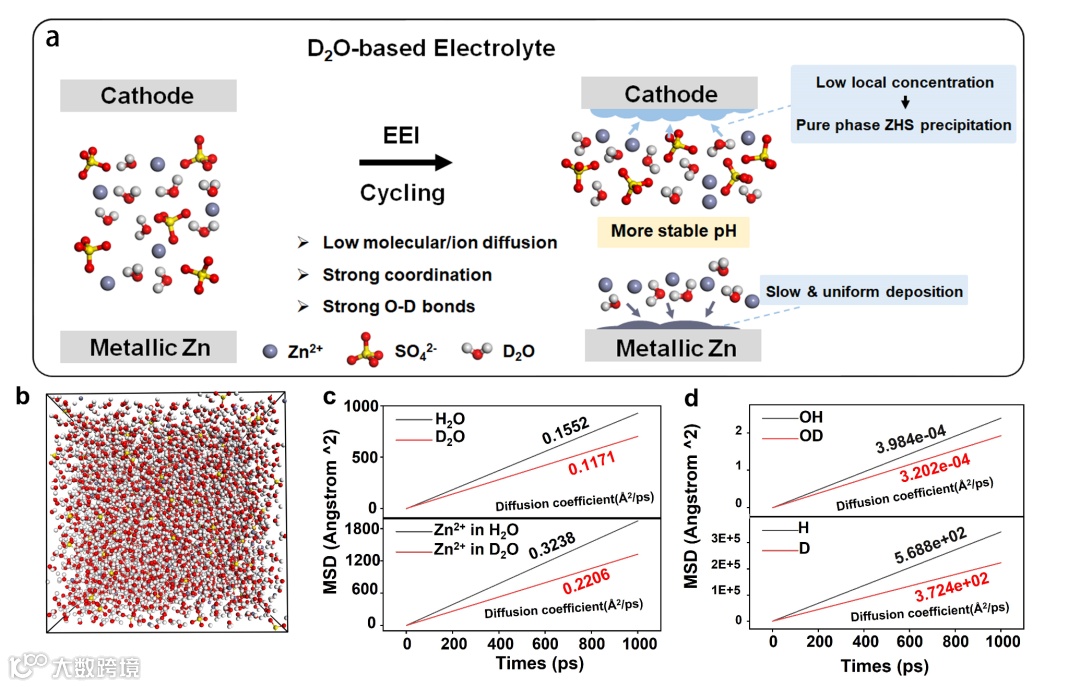 如图1a所示,基于D2O的电解质减轻了ZIBs在循环过程中的副反应,这可以归因于三个方面:分子/离子的低扩散、离子与D2O之间的强配位以及强O-D键。从负极的角度来看,Zn2+在D2O中的低扩散减缓了Zn枝晶的形成,使得Zn2+沉积形成的界面平坦。在正极,D2O的EEI通过控制ZHS结构中的结合水和ZHS的量来调节正极和电解质之间的界面。进行第一性原理计算以揭示采用不同溶质时的潜在机制。从动力学的角度研究了ZIBs中D2O和H2O之间的行为差异。我们进行了足够长的M 模拟,以了解大量电解质及其对负极表面的影响。