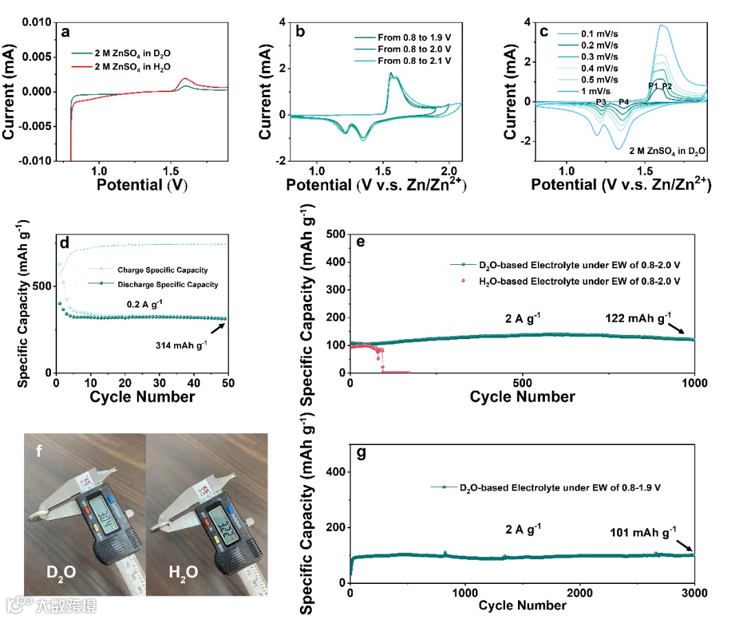 如图5d所示,基于D2O的电解质在0.8-2.0 V的EW下表现出稳定的循环性能。在0.8-2.0 V的EW条件下,基于D2O的电解质使全电池在0.2 A g-1稳定循环50次后达到314 mAh g-1的可逆容量。在2 A g-1条件下,即使 EW 扩展到 0.8-2.0 V,它在第1,000次循环时仍保持类似的电化学行为,证明了基于D2O的电解质具有非常宽的 EW 循环稳定性。如图 5e 所示,由于强烈的副反应,在 0.8-2.0 V 的 EW 下经过 73 个循环后,基于 H2O 的电解质的全电池崩溃了。