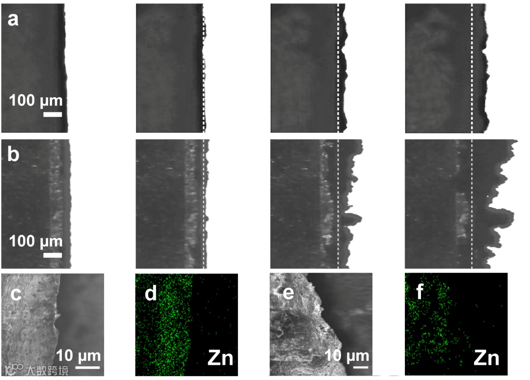 图3a显示了在1 mA cm-2的电流密度下以2 M ZnSO4溶于D2O作为电解质的Zn电镀过程的原位光学显微镜。作为对照,将 2 M ZnSO4溶解在H2O中作为电解质,在相同条件下进行原位光学显微镜观察,如图3b所示。对于基于D2O和H2O的电解质,在1 mA cm-2的电流密度下电镀30分钟后,Zn沉积物形成在表面层上。随着电镀时间的增加,Zn沉积显着增厚。