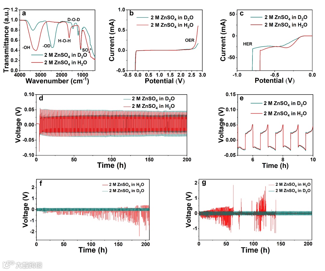 氢的同位素效应也会影响水的电化学性质。ZIBs常用的电解质,2 M 七水硫酸锌 (ZnSO4·7H2O) 分别在H2O和D2O中制备。通过观察对比图2a中的傅立叶变换红外光谱(FTIR),可以发现电解液中D2O和H2O氢氧根离子的峰位差异较大。ZnSO4在H2O中的 FTIR光谱表明在3115和1612 cm-1处存在吸收带,分别代表H2O分子的拉伸和弯曲振动。相应地,D2O分子的伸缩振动和弯曲振动分别在2468、1442和1205 cm-1。D2O基电解质中H2O的少量伸缩和弯曲振动对应于溶液制备过程中引入的结晶水。