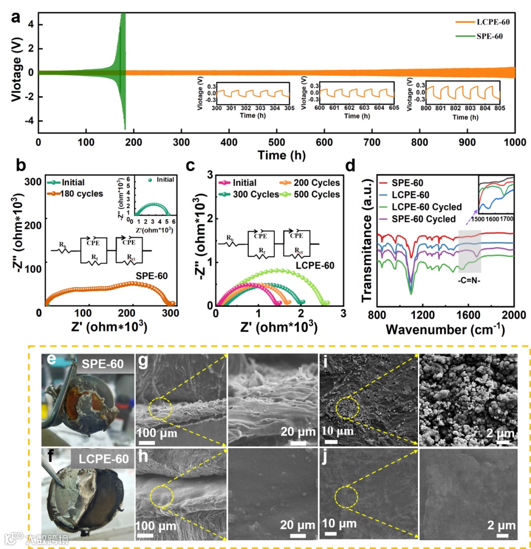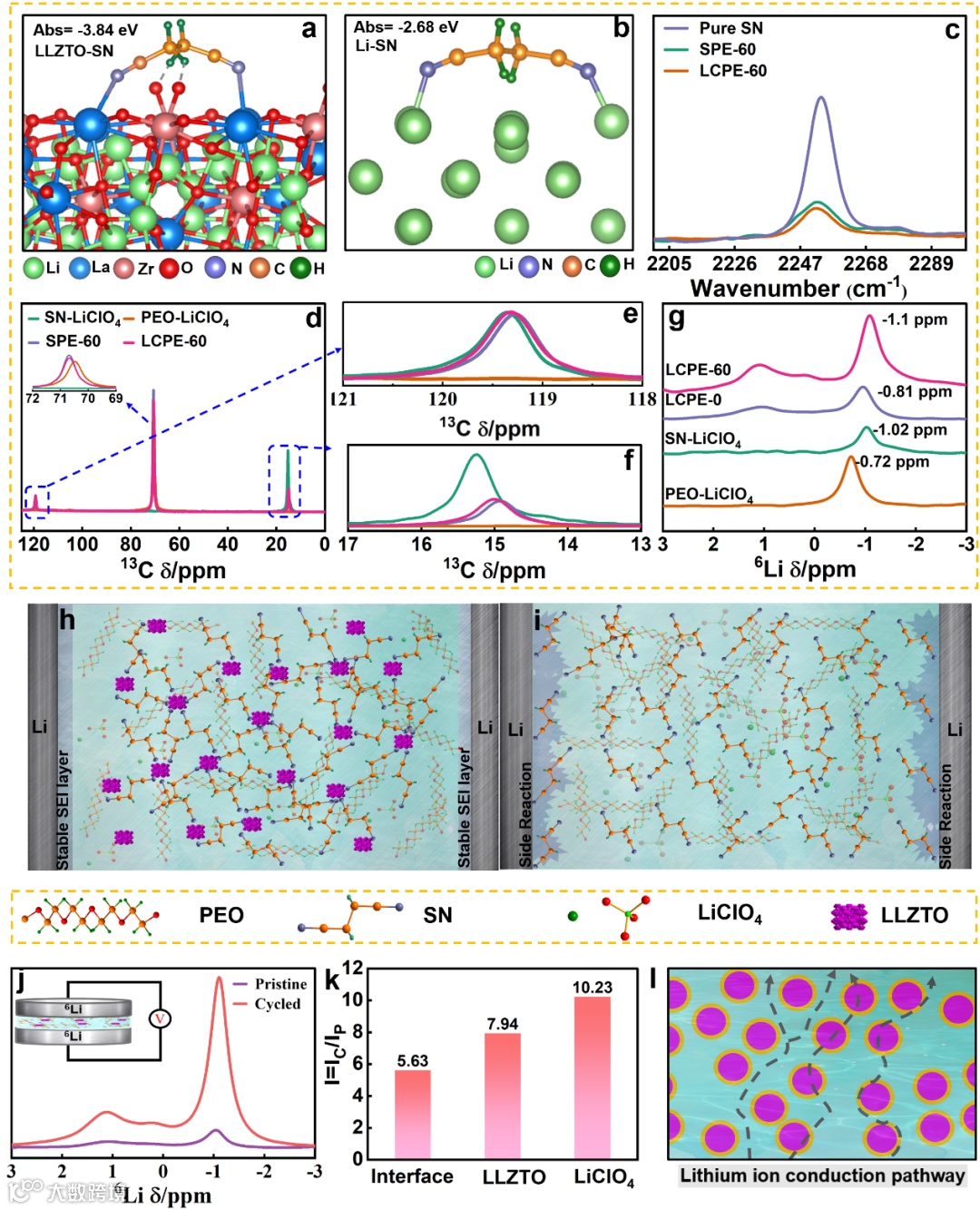 其次,在LCPE-60电解质和Li阳极之间的界面处,-C≡N基团更倾向于与LLZTO结合,而不是与Li金属结合,这大大抑制了SN和Li金属之间的不良反应。在上述过程的协同作用下,SN分子可以通过LLZTO的La3+阳离子辅助“吸附”和“锁定”在LCPE-60电解质层中(图5h)。