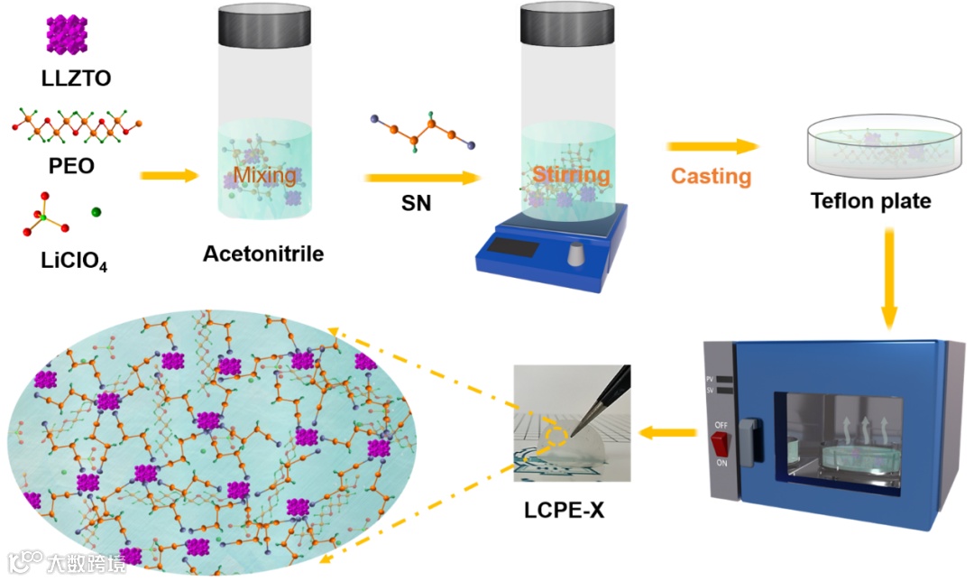 图1. LCPE-X(X=0,10,20,30,40,60,80)复合电解质的制造工艺流程图。