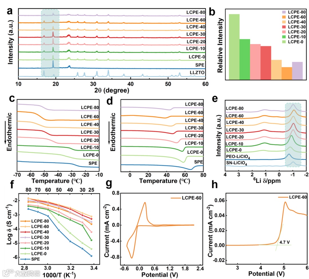 图3. SPE和LCPE-X(X=0,10,20,30,40,60,80)电解质的物理性质和电化学特性。
