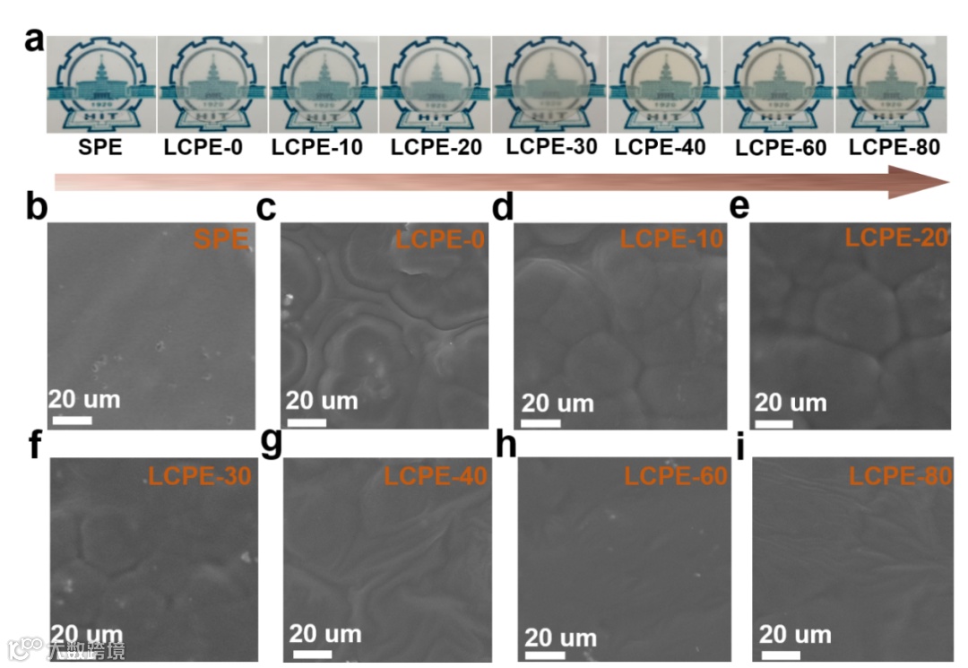 图2. SPE和LCPE-X(X=0、10、20、30、40、60、80)的光学照片和SEM图像。