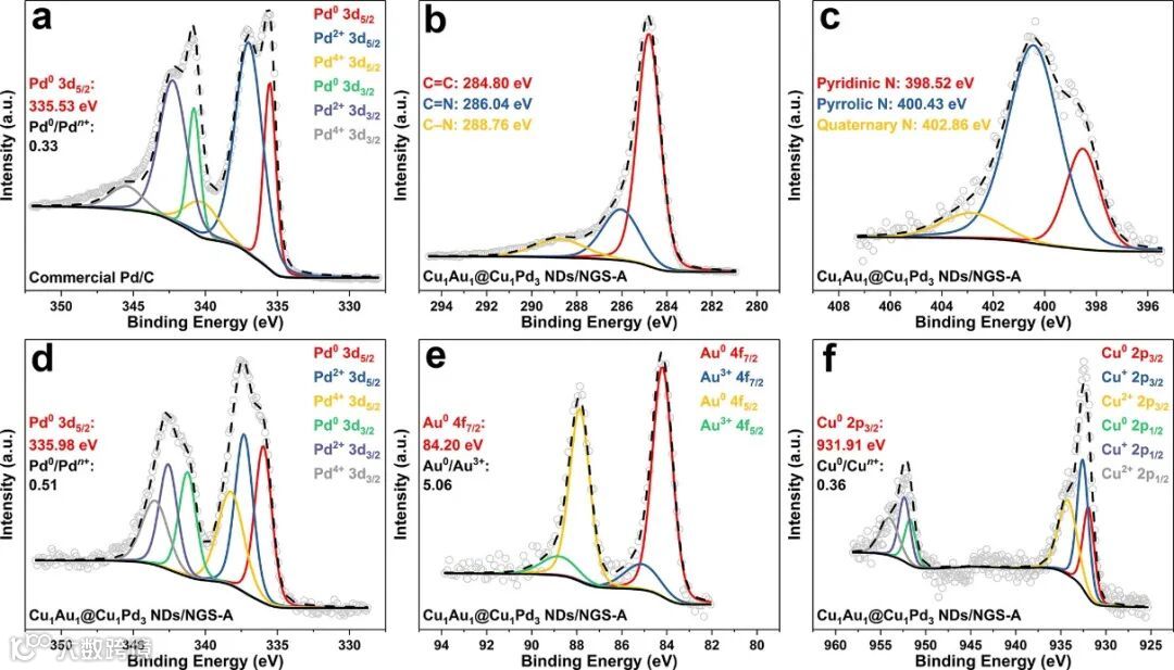 将上述合成的Cu1Au1@Cu1Pd3纳米点均匀地分散于NGS上,并通过简单的低温退火处理,将纳米点牢固地锚定在NGS表面。如图3所示,XPS测试结果显示,退火处理后的NGS中C 1s和N 1s的谱图及拟合分析结果与退火前的有明显差别,表明在退火处理后,Cu1Au1@Cu1Pd3纳米点与NGS有强金属-载体相互作用(SMSI),以致于影响到了各自的电子结构。该SMSI不仅能进一步优化纳米点的表面电子结构,还能使纳米点与NGS紧密结合,增强电催化剂的结构稳定性。