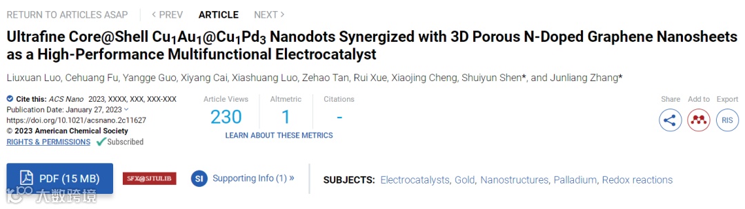 针对上述问题,上海交大章俊良教授和沈水云副教授团队在国际知名期刊ACS Nano上发表题为“Ultrafine Core@Shell Cu1Au1@Cu1Pd3 Nanodots Synergized with 3D Porous N-Doped Graphene Nanosheets as a High-Performance Multifunctional Electrocatalyst”的研究论文。
