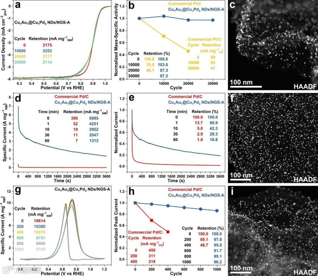 此外,如图5所示,Cu1Au1@Cu1Pd3 NDs/NGS-A还具有优异的碱性ORR电化学稳定性和碱性AOR电催化耐久性。