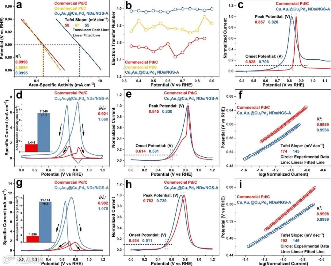 如图4所示,相比于商业电催化剂,Cu1Au1@Cu1Pd3 NDs/NGS-A表现出极大增强的碱性ORR和AOR电催化活性和贵金属利用率。其碱性ORR的面积比活性、贵金属质量比活性和Pd质量比活性分别为2.277 mA cm–2、2175 mA mg–1NM和4555 mA mg–1Pd,是商业Pd/C的13.8、49.4和103.5倍,是商业Pt/C的15.3和24.4倍。并且,该电催化剂还具有更低的Tafel Slope和更高的反应电子转移数,说明其具有更快的电荷转移速率和更好的反应动力学。
