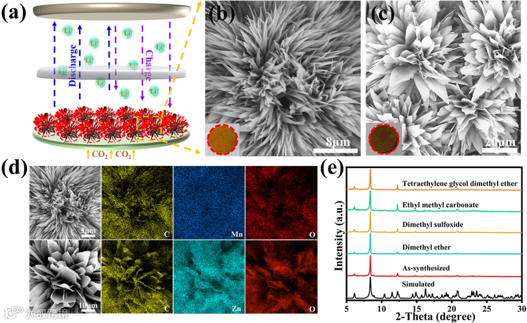 图3.(a)Li-CO2电池示意图:由锂负极、非水电解质、隔膜和空气正极组成。(b,c)Mn TTA MOL和Zn TTA MOL的SEM图像。(d)Mn TTA MOL和Zn TTA MOL的EDS核心元素分布图。(e)Mn-TTA在各种有机溶剂中浸泡24小时后的XRD谱图。