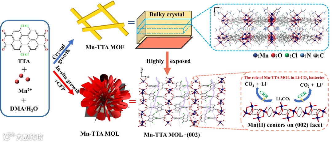 该研究制备了一种具有丰富催化表面及花状导电结构的多功能金属有机层(Mn-TTA MOL),并将其作为Li-CO2电池的正极催化剂。Mn-TTA结构中孤对电子-π相互作用的存在促进了电子转移提高了整体材料的导电性,而配位溶剂分子的逃逸在Mn-TTA MOL表界面留下丰富的活性催化空位,可以作为CO2吸附/催化转化的位点。