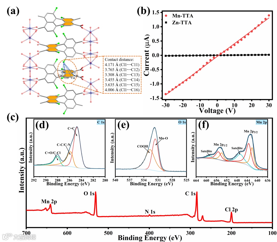 图2.(a)连接Mn-TTA中相邻金属氧化物网络的TTA分子形成梯形网络(蓝色虚线:分子间孤对电子-π相互作用)。(b)Mn TTA和Zn TTA压制样品的I–V曲线。(c)Mn TTA的XPS测量光谱, (d)C 1s,(e)O 1s 和(f)Mn 2p 光谱核心级XPS光谱