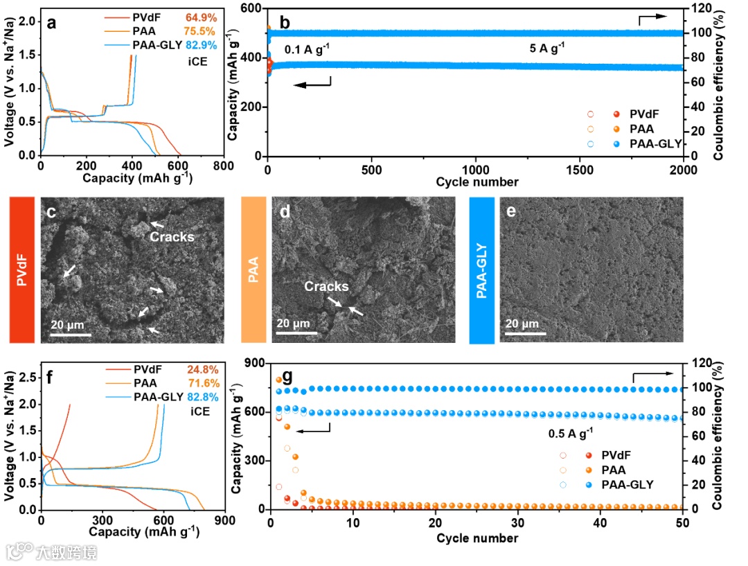当选用PAA-GLY作为粘结剂时,其第一圈循环的库伦效率明显高于PAA(85.2%)与PVDF(77.9%),达到90.3%,几乎达到了商业化石墨的水平(92%),这主要是归因于PAA-GLY的电化学稳定性,这为后续的全电性能测试中去除了繁琐的预钠化过程,为其商业化奠定了基础。