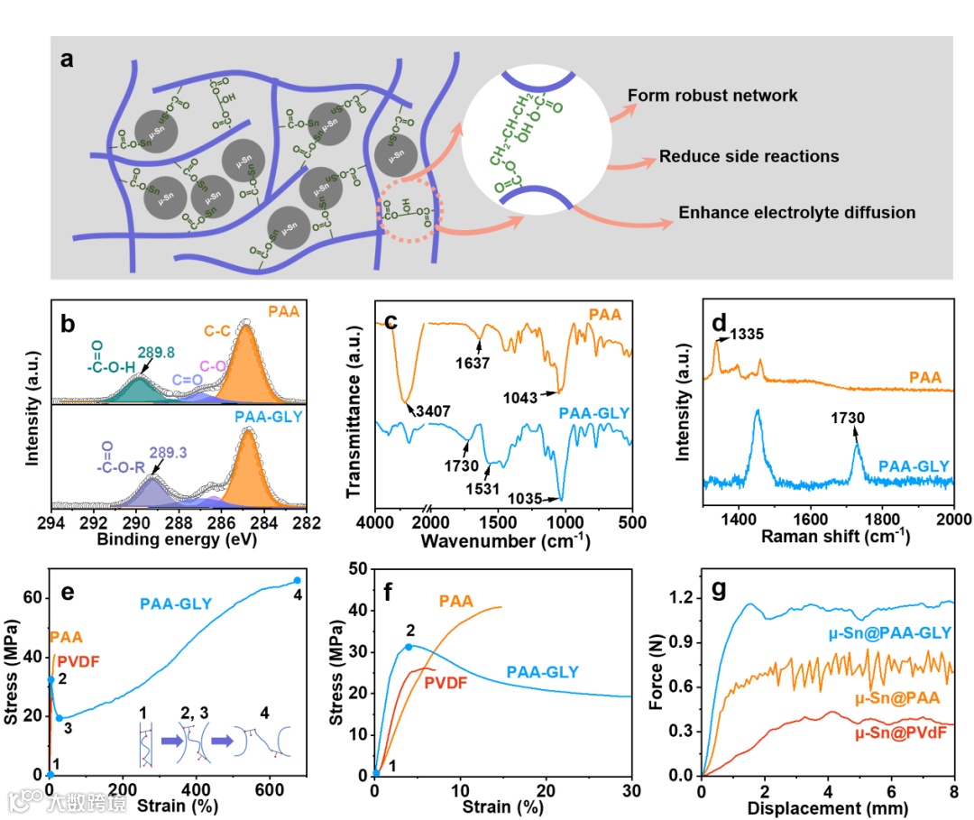 首先,作者以PAA作为粘结剂的研究模型,与羧甲基纤维素(CMC)和海藻酸钠(SA)相比,PAA具有分子量可控,官能团单一(羧基)等优点。当GLY引入时,GLY可以通过酯化反应与周围的PAA交联形成三维网络。在该种聚合物粘结剂中,PAA中的羧基官能团一部分可以将μ-Sn锚定在集流体表面,另一部分与GLY反应,在相邻PAA链之间形成坚固的互联。