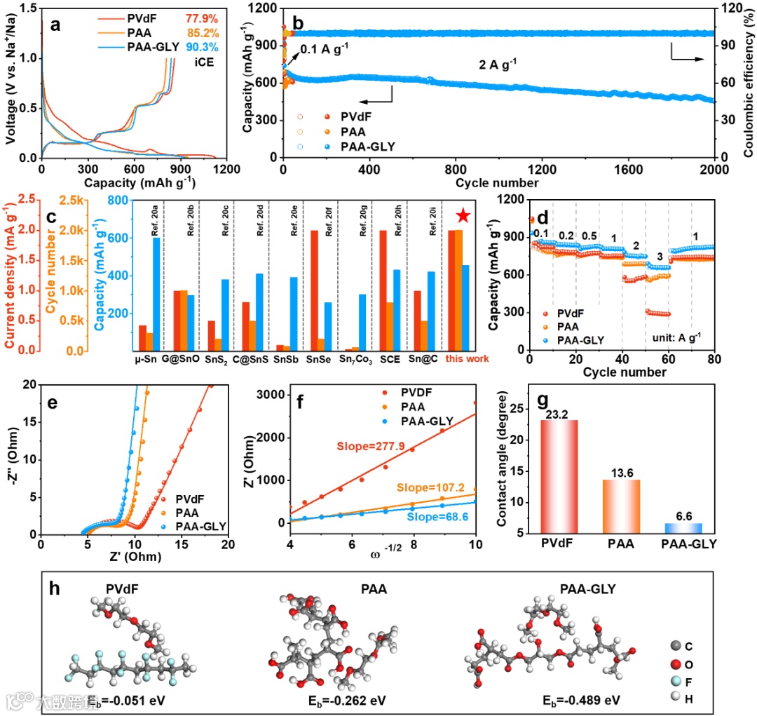 在长循环测试中,在2A g-1的电流密度下,PAA-GLY为粘结剂的电极能够稳定循环2000圈,容量保持率达到68.5%。其电化学性能超越了如果已报到的纳米Sn材料。相反,PAA和PVDF为粘结剂的电极仅仅只循环了几十圈,极大的印证了PAA-GLY交联网络粘结剂的优势。随后,作者还通过DFT计算比较了三种粘结剂与溶剂分子DGM之间的结合能,印证了PAA-GLY与电解液的润湿性,这一结果从接触角测试中也得到了印证。