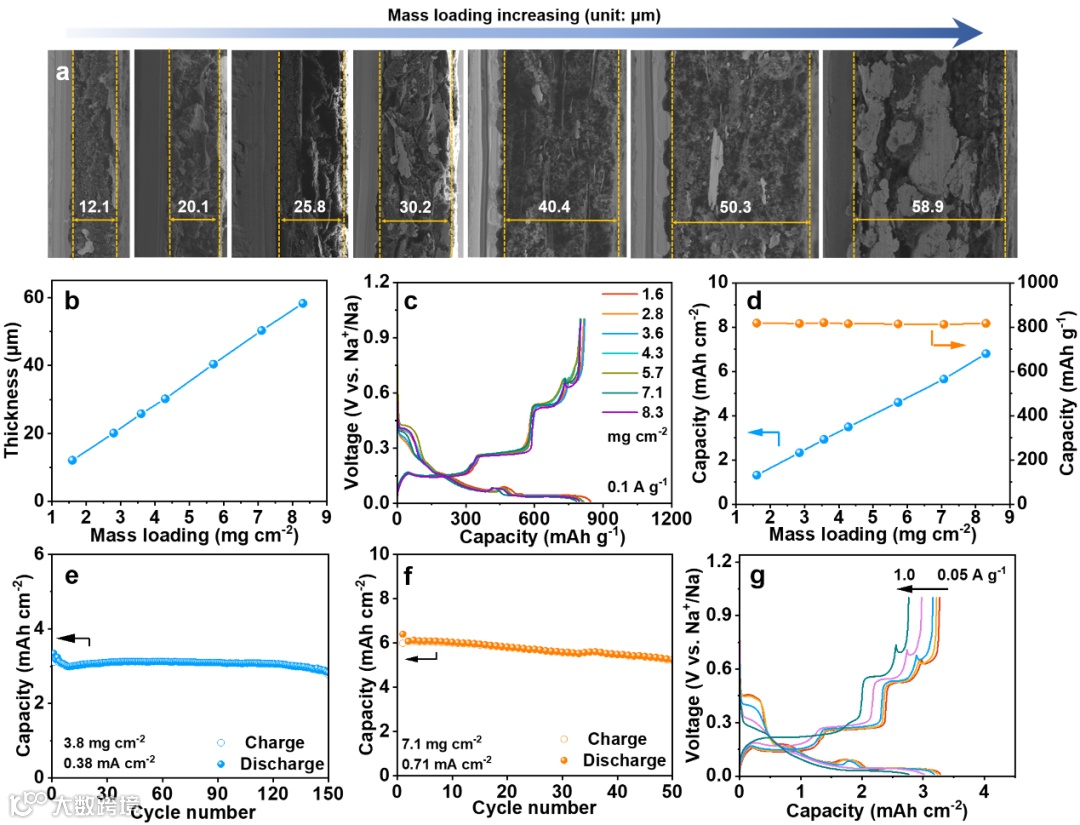 受上述电化学性能的鼓舞,作者还对厚电极进行了电化学测试。随着μ-Sn载量的增加,电极厚度呈线性增加,表明在高负载情况下,电极结构内部活性物质的均匀分布。在不同载量的充放电曲线对比中可以看到,均表现出相似的充放电平台与容量,表明电极具有良好的反应动力学。在载量为3.8mg cm-2,电流密度为0.38 mA cm-2时,能够稳定循环150圈,容量达到2.8 mAh cm-2。在更高载量7.1 mg cm-2,电流密度为0.71 mA cm-2时,容量达到5.2 mAh cm-2。进一步印证了PAA-GLY粘结剂具有优异的性能。