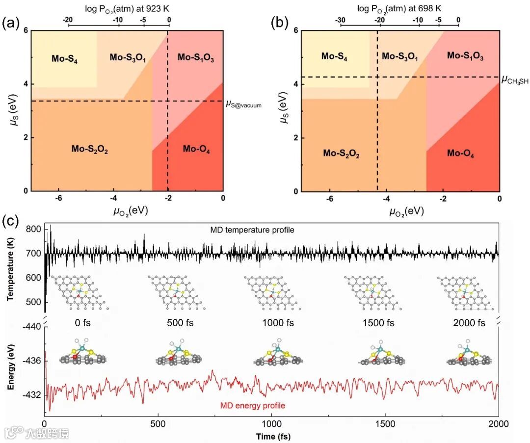 图4 热力学相图。(a) 催化剂制备过程的相图,(b) 催化剂反应过程的相图,(c) 2000 fs的AIMD模拟。