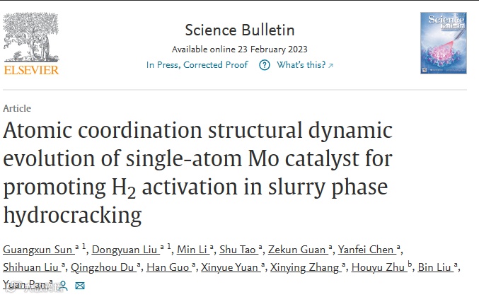 Guangxun Sun, Dongyuan Liu, Min Li, Shu Tao, Zekun Guan, Yanfei Chen, Shihuan Liu, Qingzhou Du, Han Guo, Xinyue Yuan, Xinying Zhang, Houyu Zhu, Bin Liu, Yuan Pan*, Atomic coordination structural dynamic evolution of single-atom Mo catalyst for promoting H2 activation in slurry phase hydrocracking, Sci. Bull. 2023,