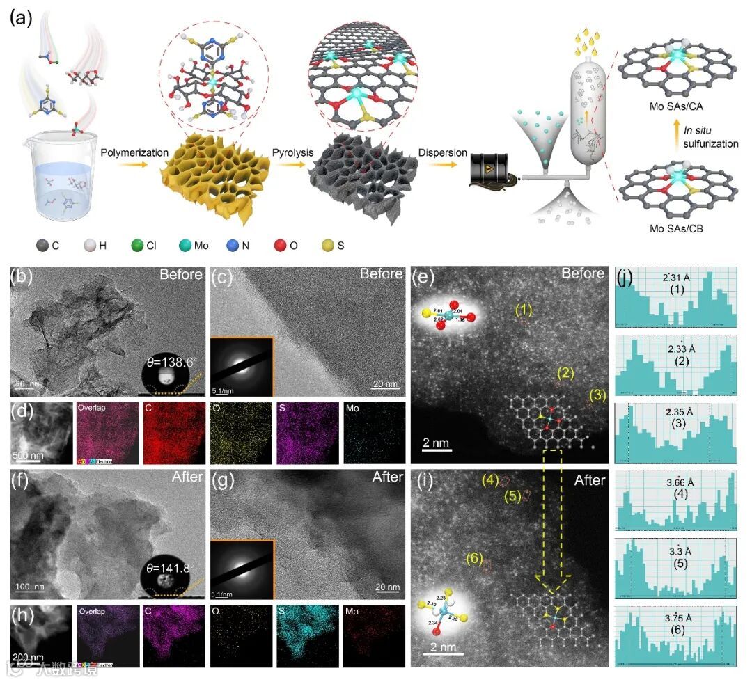 图2 碳载单原子Mo催化剂的合成及形貌表征。(a)合成示意图;反应前Mo SAs/CB催化剂的(b) TEM,(c) HRTEM,(d) HAADF-STEM-EDS mapping,(e) AC-HAADF-STEM图像;反应后Mo SAs/CA催化剂的(f) TEM,(g) HRTEM,(h) HAADF-STEM-EDS mapping,(i) AC-HAADF-STEM图像,(j)区域(1)-(6)的强度分布。(b和f、c和g、e和f中的插图显示了相应的接触角、SAED和构型)