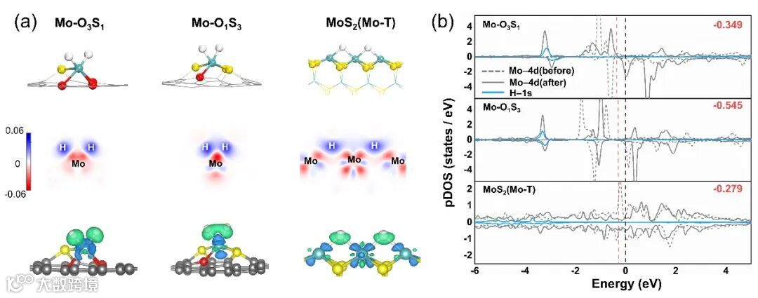 图7 通过电子结构分析活化H2的高活性起源。(a) H2解离吸附在不同配位构型上的电荷态密度差异图,(b) H-1s轨道和Mo-4d轨道在H2解离吸附前后的pDOS