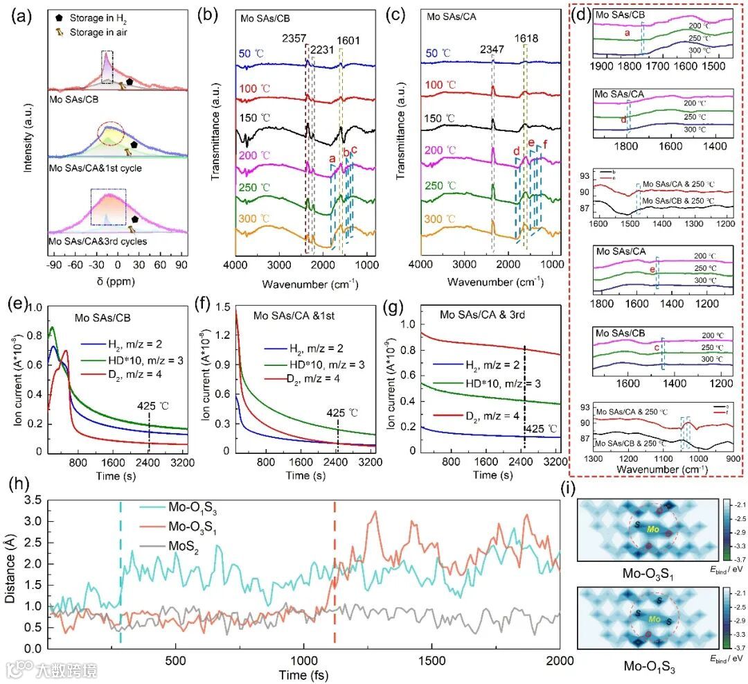 图6 H2活化机制。(a) 固态核磁H谱,(b) Mo SAs/CB催化剂的原位红外谱图,(c) Mo SAs/CA催化剂的原为红外谱图,(d) 图6b, c的局域放大图,(e) Mo SAs/CB催化剂的H-D交换图,(f) Mo SAs/CA & 1st cycle催化剂的H-D交换图,(g) Mo SAs/CA & 3rd cycles催化剂的H-D交换图,(h) H2在不同配位构型上吸附的AIMD模拟,(i) H原子在Mo-O3S1和Mo-O1S3表面上方不同位点上的结合能 (Ebind)级图。