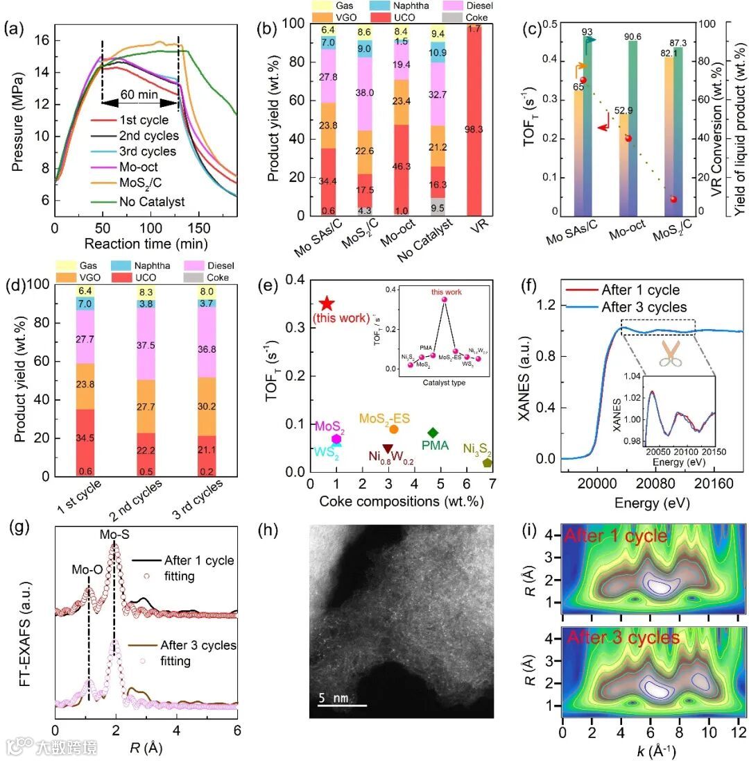 图5碳载单原子Mo催化剂的重油加氢性能。(a)耗氢曲线,(b)产物收率,(c)轻油收率,转化率和TOFT, (d)循环性能,(e)结焦率和TOFT与文献报道的比较。Mo SAs催化剂循环1次和3次的结构分析(f) K边XANES,(g) R空间EXAFS拟合,(h)循环3次后的AC-HAADF-STEM图像,(i) 小波变换图